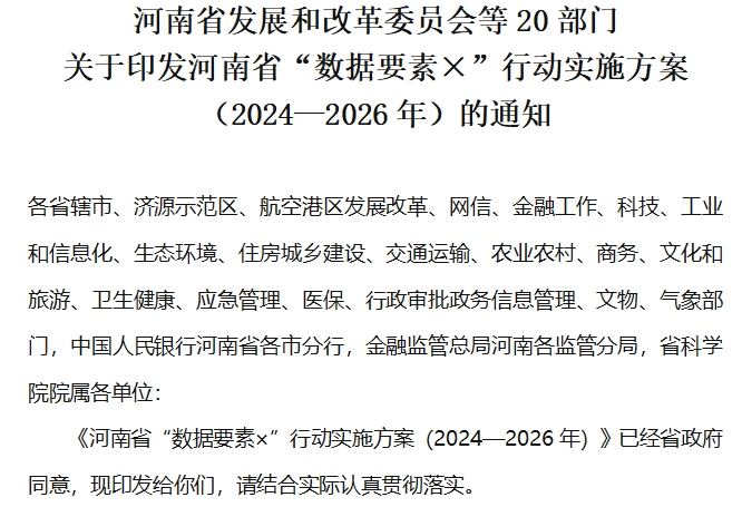 河南省發(fā)展和改革委員會等20部門 關于印發(fā)河南省“數據要素×